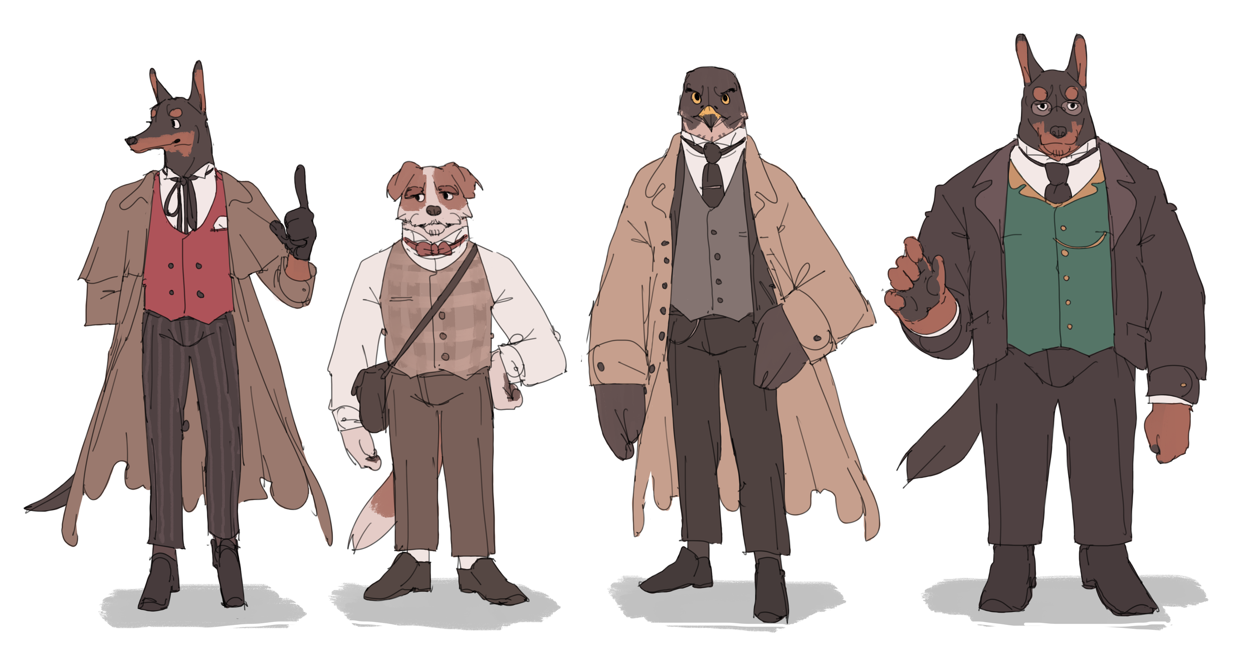 Concept art for an original reimagining of Sherlock Holmes, featuring an anthropomorphic animal cast in a post World War 1 setting.